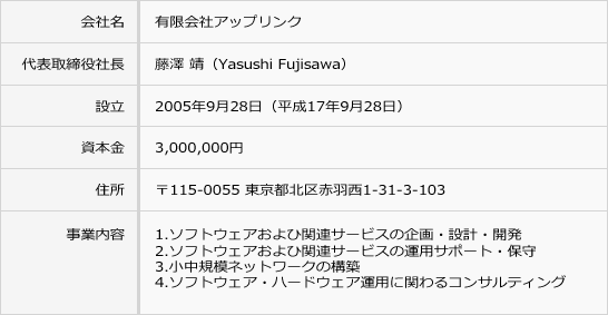 有限会社アップリンクは、ExcelやAccessを利用して自社で独自に作成されたシステムを、効率の良い新たなシステムへ移行させるお手伝いやパッケージシステム(販売管理・施設利用者管理など)をベースに、お客さまの業務に合わせたカスタマイズを行いご提供する会社です。